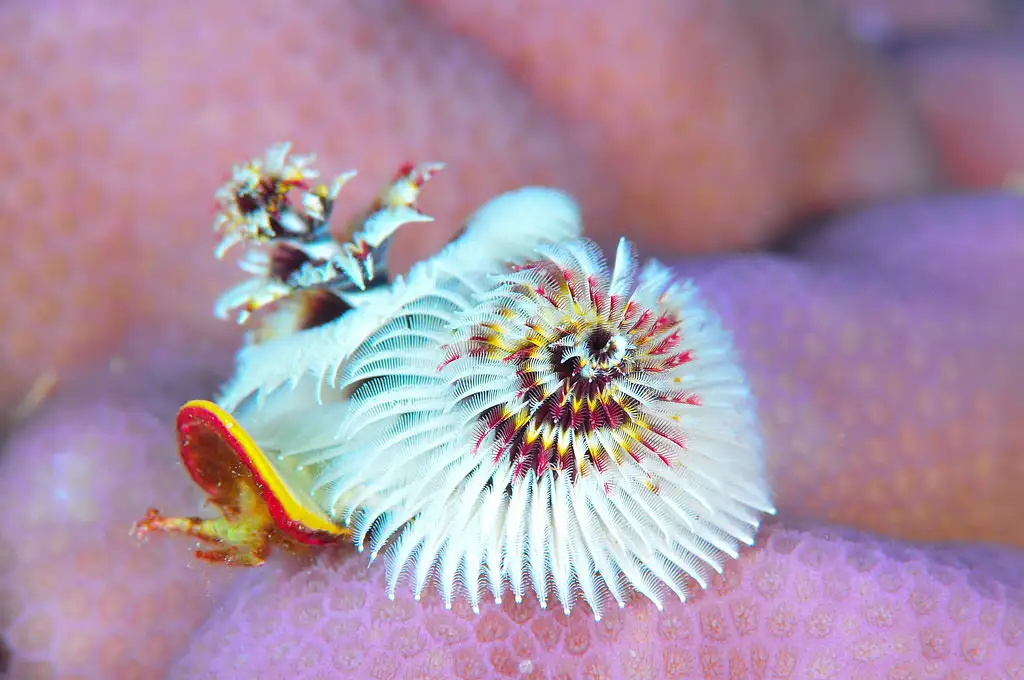 圣诞树蠕虫(Spirobranchus giganteus)是多毛纲蛇形蠕虫科(Serpulidae)的典型管栖环毛虫。 其双簇螺旋展开的羽冠用于滤食与呼吸,酷似彩色“圣诞树”,是热带珊瑚礁常见的高识别度物种。