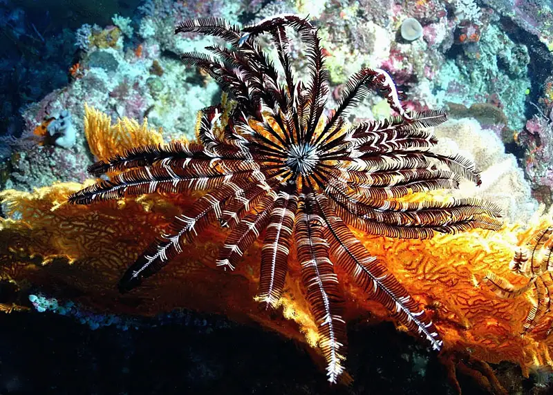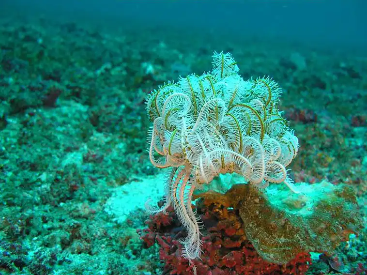 Q2:与海星/海胆是什么关系?同属棘皮动物,海百合类独立为海百合纲,以悬浮摄食与羽状臂为特征。