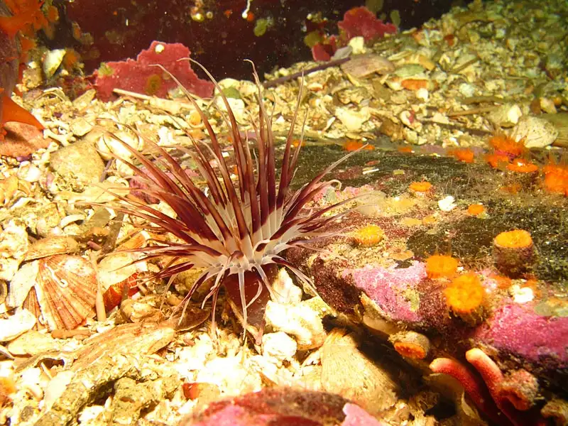 膜管海葵(Cerianthus membranaceus)是一种典型管海葵类刺胞动物, 属于珊瑚虫纲八放亚纲/管海葵目(Ceriantharia)膜管海葵科(Cerianthidae)。 它不会像普通海葵那样直接黏在岩石表面,而是把身体“种”在自己制造的柔韧管状巢管里, 并半埋在沙泥或海草床边缘的沉积物中,所以常被称为“管海葵”“管状海葵”。