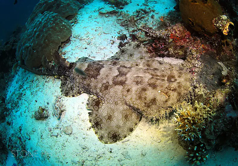 Q3:如何识别须鲨?口周触须与皮瓣、地毯样斑纹、体扁头宽,常伏在海底。