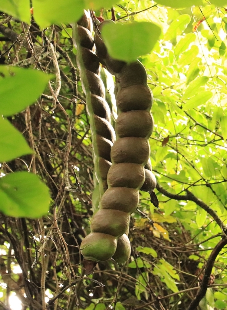 榼藤(Entada phaseoloides (L.) Merr.)隶属于豆科榼藤属,是常绿木质大藤本植物。它的藤茎粗壮有力,能攀缘至 50 米以上,缠绕在高大的乔木间,宛若林间的“绿色桥梁”。