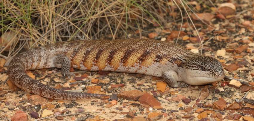 身体呈粗壮圆筒状,头部宽大,四肢短而强壮,尾巴较短粗。背部多为灰褐、黄褐或橄榄色底色,上覆深棕至黑色横带或不规则条纹,形成斑驳花纹;腹面颜色较浅,多为奶油色或淡灰色。最引人注目的是宽大而闪亮的蓝色舌头,在防御展示时尤为醒目。